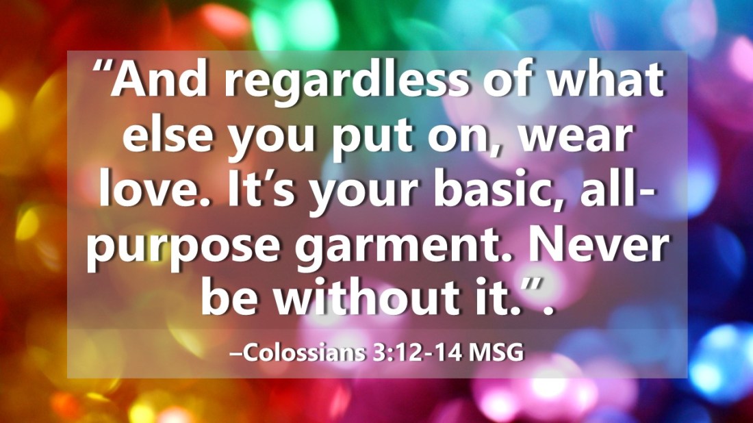โSo, chosen by God for this new life of love, dress in the wardrobe God picked out for you: compassion, kindness, humility, quiet strength, discipline. Be even-tempered, content with second place, quick to forgive an offense. Forgive as quickly and completely as the Master forgave you. And regardless of what else you put on, wear love. Itโs your basic, all-purpose garment. Never be without it.โ โColossians 3:12-14 MSG