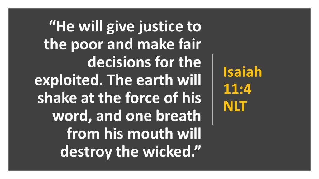 This week I was reading the book of Isaiah. Isaiahโs prophecies about the coming Messiah became an important part of the expectations of a Messiah in Jesusโ time, and still inform our expectations for Jesusโ second coming. In Isaiah 11, it says that the Spirit of the Lord will be upon him, and he will have wisdom and understanding. Verse 4 says, โHe will give justice to the poor and make fair decisions for the exploited. The earth will shake at the force of his word, and one breath from his mouth will destroy the wicked.โ