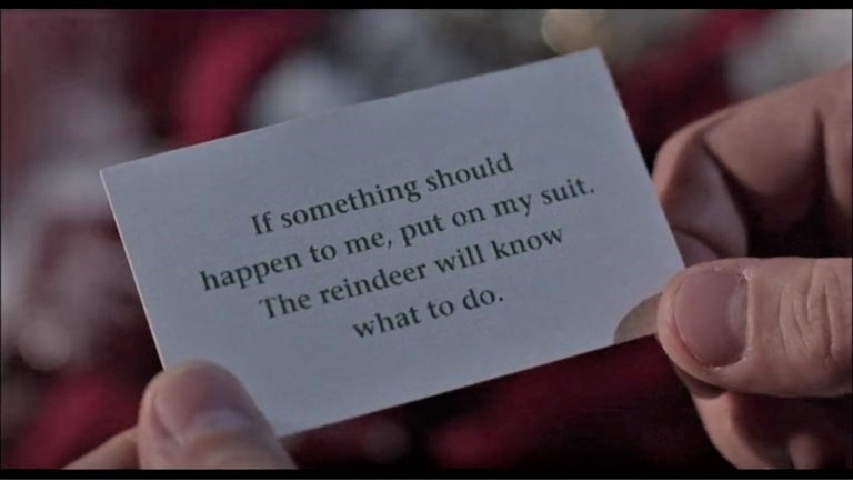 Afterwards, the reindeer take Scott and Charlie to the North Pole, where Scott is informed by the head elf Bernard that he is the new Santa Claus. When Scott protests saying that he doesn’t want to be the new Santa, Bernard tells him that he accepted the contract by putting on the suit. Bernard shows Scott the fine print on the other side of the business card. It says, “In putting on the suit and entering the sleigh, the wearer waves any and all rights to any previous identity, real or implied, and fully accepts the duties and responsibilities of Santa Claus in perpetuity until such time that the wearer becomes unable to do so by either accident or design.”[1]