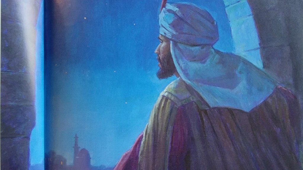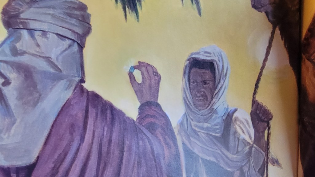 Hurriedly thanking the man, Artaban dashed to his horse and galloped off toward the Temple. Although Vasda fled over the ground like a gazelle, the sun’s first rays were shining as they entered the Temple grounds. Anxiously Artaban searched for his friends but they were gone. Under a piece of brick he found a note which read: “We have waited past midnight and can delay no longer. We go to find the King, Follow us across the desert.”