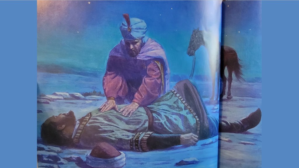 Suddenly, Vasda stopped as if afraid, and Artaban saw something in the road. He slid from his horse and approached the dark shape for a closer look. It was the body of a man. Artaban felt the man’s forehead and listened for the sounds of breathing. The man seemed dead, but as Artaban turned to go, the poor man groaned, reached out one hand, and grasped the hem of the wise man’s robe. The man was still alive!